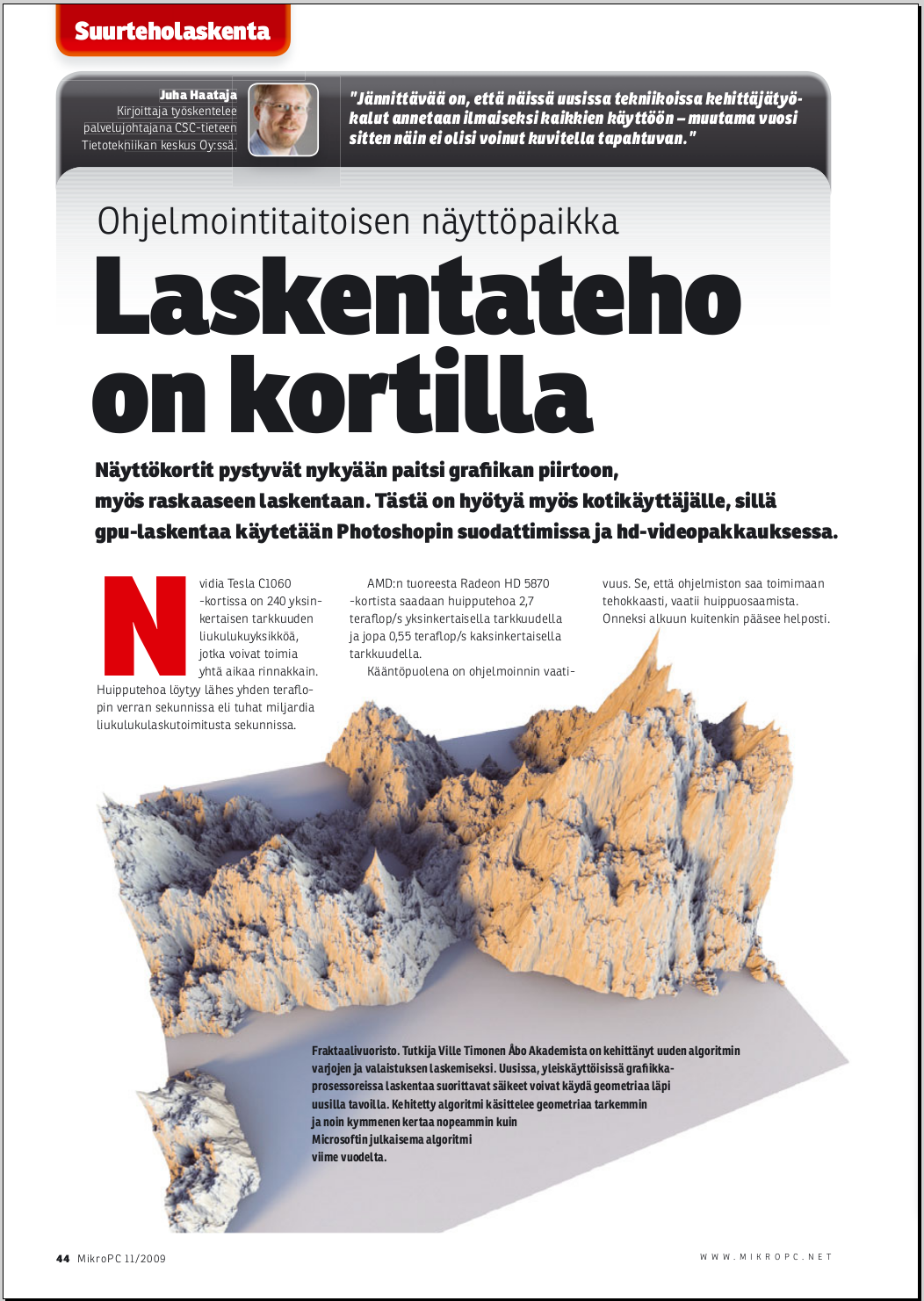 At this point our laboratory was consulted by CSC for an article they were writing for MikroPC (a popular finnish computer magazine). The article was about GPGPU technology, and in addition to statements, they asked if we had some examples they could use in the article. We decided to give a screen capture of the algorithm I had made, but I wasn't sure it would even end up in the article. When the article got published, I was surprised to see it occupying half of the first page (see the actual article page here).